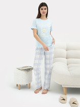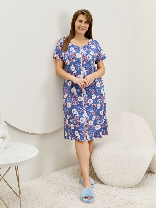 Халат женский из гладкокрашенного трикотажно полотна «кулирка» с набивным рисунком, полуприталенного силуэта, с короткими рукавами покроя «реглан» и горловиной овальной формы, окантованной основным материалом, с центральной бортовой застежкой на тесьму «молния». По срезу горловины выполнены неглубокие складки, нижние резы рукавов обработаны притачными манжетами с кантом контрастного цвета.