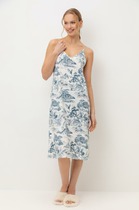 Халат женский из трикотажного полотна «кулирка» с набивным рисунком, прямого силуэта, с короткими втачными рукавами, горловиной фигурной формы, двумя накладными карманами на уровне бедер и центральной бортовой застежкой на тесьму «молния». Полочка – с рельефными швами, выходящими из горловины. Нижние срезы горловины обработаны притачными планками. Остальная часть горловины окантована основным материалом.
