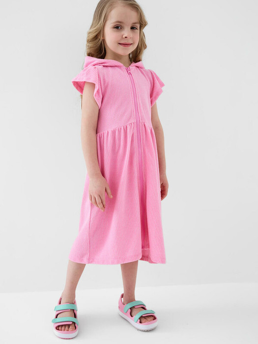 Детский махровый халат на молнии для девочки. Выполненный из мягкой хлопковой трикотажной ткани. Капюшон, короткие рукава с оборками и расклешённый низ. Центральная застёжка-молния делает халат удобным для повседневного использования. Светлый розовый цвет в белую полоску.