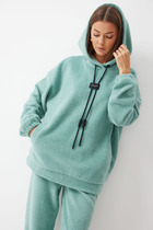 Джемпер прямого силуэта из комфортного трикотажного полотна. Горловина обработана капюшоном. Рукав со спущенной линией плеча, по низу на резинке. По низу джемпера притачной пояс. По переду декоративная нашивка и шнур. Обращаем ваше внимание, что фурнитура может отличаться от фото.