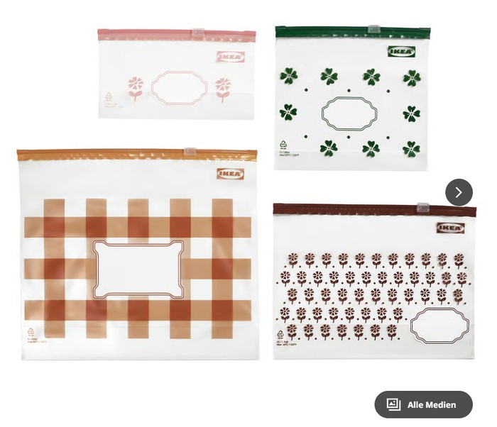 В упаковке: 20 пакетов по 0,5 л (внутренние размеры 18х10 см), 20 пакетов по 1 л (внутренние размеры 18х17 см), 20 пакетов по 2 л (внутренние размеры 24х18 см) и 20 пакетов по 4 л (внутренние размеры 28х24 см).