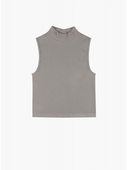 Майка-топ выполнена из полиамида песочного цвета, в рубчик, с высоким горлом, без рукавов, укороченная, облегающая, на мягкой резинке.