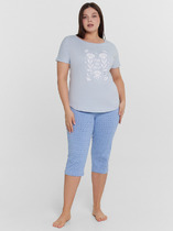 Пижама женская изготовлена из полиэстера с добавлением хлопка и вискозы. В комплекте майка с шортами. Майка на тонких регулируемых бретелях имеет декоративный элемент в зоне декольте. Шорты с аналогичным декоративным элементом держатся на талии тонкой эластичной резинкой.