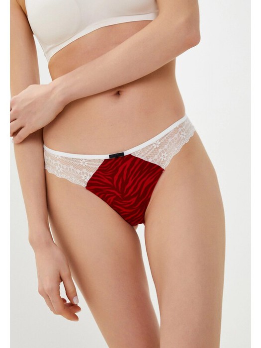 Трусики-стринги из хлопка, красного цвета, с принтом, с кружевными вставками белого цвета, с кружевной белой задней частью, на мягкой резинке.