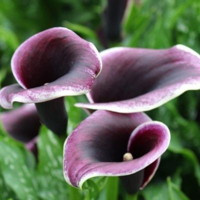Калла Дубай Найт - многолетнее травянистое растение с клубневидным корневищем. Высота каллы около 75 см. Цветы насыщенного бархатно-пурпурного цвета с кремовыми краями дополняются очень крапчатой листвой. Растение станет прекрасным украшением вашего сада.