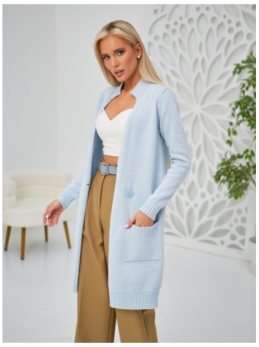 Кардиган женский из пряжи с мохером прямого покроя длиной выше колена. Рукав втачной прямого покроя стандартной длины. Вырез горловины V-образный глубокий, с воротником стойкой. Линия борта центральная с двубортной застёжкой на петли и пуговицы. На переде кардигана расположены два накладных кармана функционального назначения.