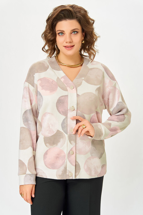 Кардиган из мягкого вискозного трикотажного полотна прямого силуэта со спущенной линией плеча и центральной застёжкой на петли и декоративные пуговицы. Горловина и борта обработаны фигурной планкой из основной ткани. Вырез горловины V-образной формы, рукав длинный, по низу с манжетой из основной ткани.