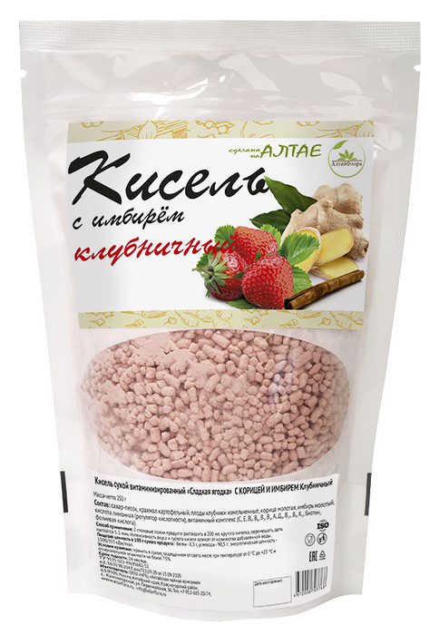 Сахар-песок, крахмал, мякоть плодов клубники измельченная, кислота лимонная (регулятор кислотности), витаминный комплекс (А, С, D, В1, В2, В3, В5, В6, В9, В12, РР, биотин) корица молотая в/с, имбирь молотый в/с