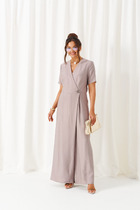 Комбинезон свободного силуэта со спущенным плечом и застежкой на потайную тесьму молнию с переди. Вырез горловины круглый. Рукав втачной длинный. В боковых швах действующие карманы.