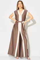 Комбинезон женский повседневного назначения,отрезной по линии талии . Воротник-шалька уходит в линию талии на запах,где фиксирует на пуговицы с обеих сторон. Застёжка центральная на тесьму-молнию. По спинке имеется центральный шов. Расклешение брюк от линии бедер.В качестве декоративной отделки служит съёмный пояс по линии талии.