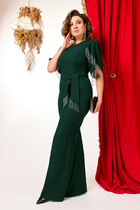 Лёгкий комбинезон с брюками клёш от бедра и максимальной длиной, сшироким поясом-кушаком из основной ткани (входит в комплект и стоимость изделия).