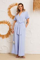 Комбинезон женский, отрезной по линии талии. Верхняя часть с рельефами по переду и вытачками по спинке. Воротник стояче-отложной. Застёжка на запах, на петли, пуговицы и потайную магнитную кнопку. Рукав втачной длинный, заканчивается манжетой с застежкой на петли-пуговицы. Нижняя часть комбинезона со складками и имитацией запаха. В боковых швах карманы. По спинке резинка на уровне талии.