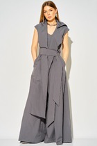 Массивные накладные карманы-портфели на брючинах выше линии колена, не только функциональны, но и задают современный урбанистический ритм. Декоративные хлястики добавляют нотку стиля милитари, смягченную общей мягкостью линий. Низ брюк затягивается на резинку с ограничителем создает эффект- шаровар,  и так же раслабленном виде брюки имеют классическкий вид - палассо.