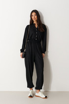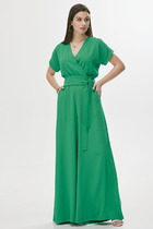 Комбинезон брючный. Рукав-реглан, по низу рукава отложная манжета с отлетной патой на застёжку петля/пуговица. Воротник пиджачного типа, застёжка на петли/пуговицы, в области груди накладные карманы. По линии талии отрезной пояс с патами, по задней части пояса вставлена резинка. Брюки расширенные книзу, по переду накладные карманы. Пояс в комплекте.