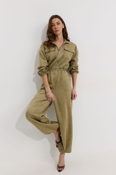 Комбинезон полуприлегающего силуэта с расширенными книзу брюками из трикотажного полотна “замша”. Горловина-стойка, по центру застежка на молнию. Рукав со спущенной линией плеча, по низу эластичная тесьма(резинка). По переду и спинке в районе талии притачной пояс, в пояс вставлена эластичная тесьма(резинка). По переду накладные карманы с клапанами. Брюки прямого силуэта, по переду  и спинке карманы. По низу брюк предусмотрена кулиса с завязкой для регулирования степени прилегания. Обращаем ваше внимание, что фурнитура может отличаться от фото.