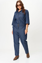 Комбинезон полуприлегающего силуэта. Комбинезон отрезной по линии талии. лиф спинки со средним швом, в котором обработана застежка на потайную тесьму-«молнию». Лиф переда с талиевыми вытачками. Брюки длинные, широкие. По задним половинам брюк талиевые вытачки. Комбинезон выполнен на регулируемых бретелях с фигурным вырезом горловины. Лиф комбинезона двойной из основной ткани. Комбинезон дополняет съемный волан.