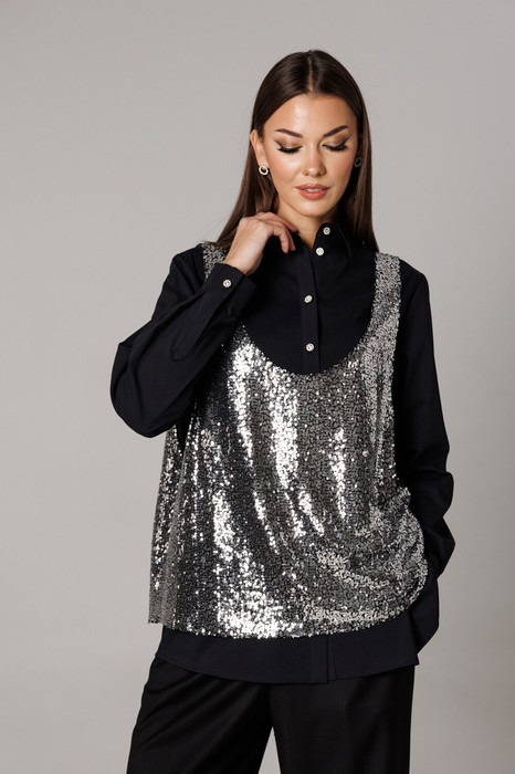 Майка выполнена из трикотажного полотна с пайетками свободного прямого силуэта в стиле оверсайз. Спереди и сзади имеет глубокие овальные вырезы и удлиненную линию проймы. Майка съемная. Длина изделия от плечевого шва по спинке 62 см.