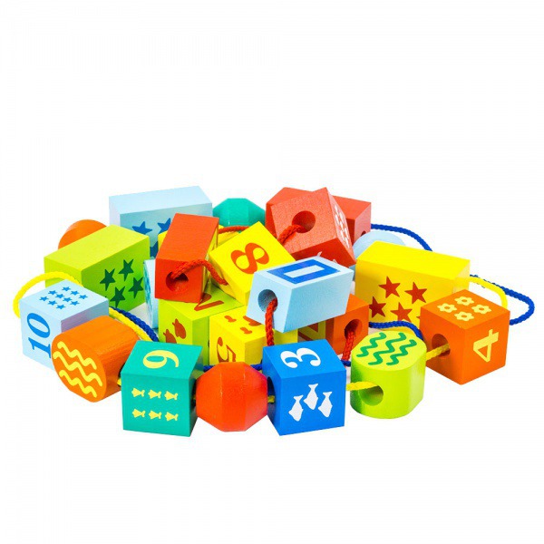 В наборе насчитывается: 10 кубиков с количественными картинками и цифрами, 20 фигурок овальной, прямоугольной, круглой формы и несколько крепких шнурков. Яркое цветовое исполнение привлекательно для малыша.
