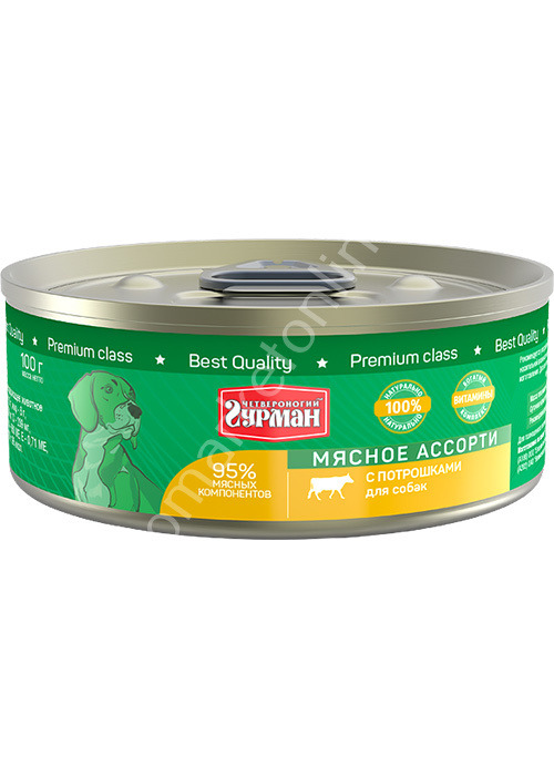 Корм премиум класса, в составе которого 95% мясных компонентов исключительно высшего качества. Состав: рубец (36%), сердце (22%), легкое, печень, коллагенсодержащее сырьё, животный белок, масло растительное, вода.