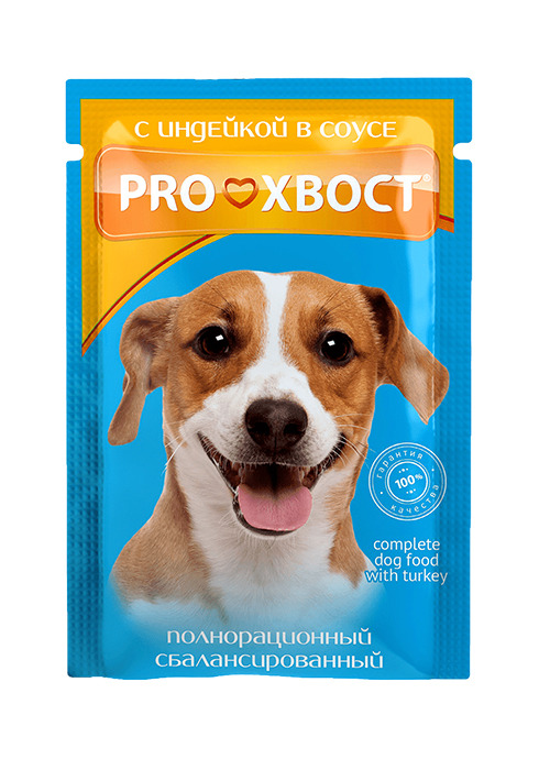 Консервированный полнорационный корм для собак с индейкой в соусе. Ежедневное питание для взрослых собак всех пород. Особенности корма Proхвост: Сытный рацион со вкусом индейки состоит из сочных кусочков и подливки. Причем некоторые питомцы подливку любят даже больше, чем мясную часть. Корм сбалансированный. Это значит, что вместе с едой собака получает все необходимые питательные вещества. Консервированный корм можно чередовать с сухим, чтобы разнообразить еду питомца. Корм содержит витамины А, D, Е, а также кальций и фосфор – для иммунитета, шерсти и зубов. С мягкими мясными кусочками справятся даже пожилые питомцы, которые в силу возраста не могут есть твердую пищу. Корм подходит для питомцев любых пород, особенно небольшого и среднего размера, для которых 1-2 пакетика составляют разовую порцию.