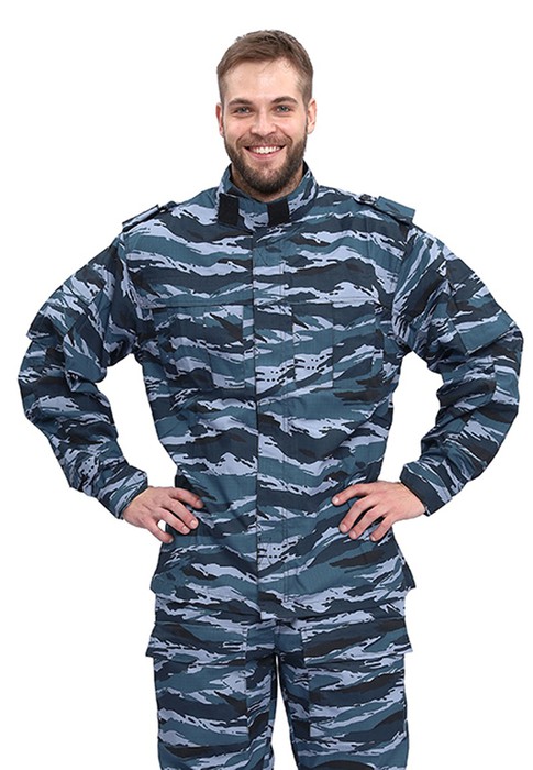 Куртка прямого силуэта удлиненная, фасон предполагает возможность заправить куртку в брюки. Центральная застежка на молнию с планкой на липучках; два нагрудных объемных накладных кармана со складками на молнию под отлетным краем кокетки; погоны на пуговице; спинка со складками до линии талии для свободы движения; рукава на манжете с патой на широкой липучке; накладные объемные карманы на рукавах с клапаном на липучке; усилительные накладки в области локтя; воротник стойка с патой на липучке; внутренний навесной карман на липучке.