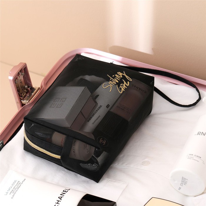 Прозрачный органайзер изготовлен из мягкой нейлоновой сетки в стильном черном цвете. Бегунок на молнии декорирован золотой звездочкой.Дышащая ткань не допустит оседания посторонних запахов. Косметичка легко стирается и быстро сушится. Удобный аксессуар для хранения средств по уходу и предметов личной гигиены. Идеальна для любых путешествий, командировок и поездок на море, а также для хранения косметики и различных аксессуаров дома.