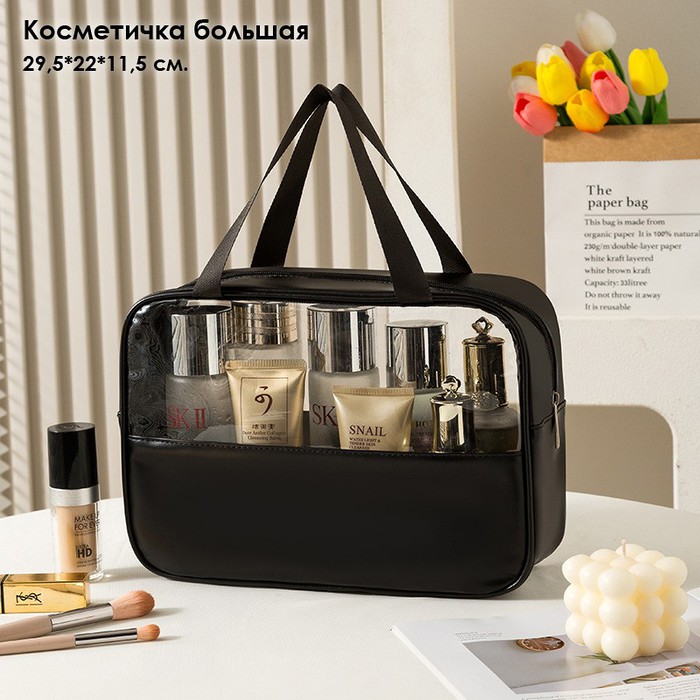 Водонепроницаемая большая косметичка для бассейна с ручками прямоугольной формы удобного и практичного размера: ширина 29,5 см., высота 22 см. и глубина 11,5 см. Силиконовая влагозащитная косметичка не пропускает воду и влагу, стенки матовые полупрозрачные, имеет крепкую застежку молнию, один большой вместительный отдел без перегородки. Использовать не промокаемый кейс можно для плавания в бассейн для мокрого купальника и других мокрых или грязных вещей. Для походов в баню, в сауну или хамам под мочалку, шампунь и другие банные аксессуары. В отпуск на море на пляж, чтобы не мочилась косметика и сухие вещи. Для душа или для ванной для хранения душевых и банных принадлежностей. Как органайзер для хранения под средства и предметы личной гигиены. Как бокс для хранения лекарств и таблеток вместо аптечки. Косметичка легко умещается в чемодан на поездку или в путешествия. Благодаря стильному дизайну сумочка может быть не только как женская для женщин или мужская для мужчин, но и детская для разных мелочей, карандашей, кукол, школьной канцелярии. Мастера маникюра и макияжа, визажисты и косметологи, бровисты и парикмахеры могут использовать как несессер или органайзер для своих инструментов.