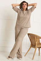 Костюм женский. В комплект входит футболка с рукавом 3/4 и бриджи ниже колен, без карманов. По переду асимметрия из двух видов ткани.