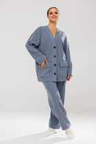 Костюм женский из кулирного полотна состоит из футболки и брюк. Футболка прямой силуэт. Горловина круглая, рукав короткий, втачной, низ изделия обработан на плоскошовной машине. Брюки прямые, верх на поясе с резинкой, в боковых швах внутренние карманы, низ изделия с манжетом. На полочке и передней половине брюк принт.