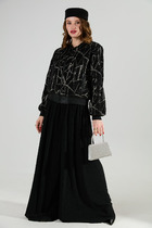 Костюм женский из велюра состоит из кофты и брюк. Кофта прямая, горловина круглая, обработана обтачкой, рукав длинный, втачной, внизу на манжете, на полочке принт, низ изделия с поясом. Брюки прямые, верх на поясе с резинкой, два внутренних кармана, на передней половинке брюк принт, низ брюк с манжетами.