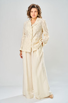 Костюм женский из кулирного полотна состоит из кофты и брюк. Кофта прямого силуэта, горловина круглая, обработана окантовкой, рукав длинный, втачной, низ на манжете, на полочке принт, низ изделия на поясе. Брюки прямые, верх на поясе с резинкой, низ на манжете, в боковых швах внутренние карманы, на передней половине брюк принт.
