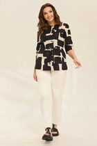Костюм женский из кулирного полотна состоит из футболки и брюк. Футболка прямого силуэта, горловина круглая, обработана окантовкой, спущенное плечо, рукав короткий втачной, по низу изделия кулиска со шнуром, на полочке принт. Брюки прямые, верх на поясе с резинкой, в боковых швах внутренние карманы, низ изделия на резинке.