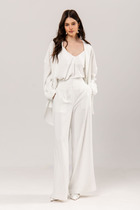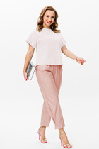 Описание Костюм состоящий из джемпера и брюк. Джемпер прямого силуэта из трикотажного полотна. Воротник - широкая стойка. Горловина с застежкой на петлю и пуговицу. Рукав одношовный втачной, чуть спущена линия плеча. По низу джемпера в боковых швах разрезы. Обращаем ваше внимание, что фурнитура может отличаться от фото. Брюки прямого силуэта из трикотажного полотна. По верху брюк притачной пояс, по переду застежка молния в среднем шве, карманы в боковых швах и декоративные складки. На задних половинках брюк прорезные листочки. По задним половинкам брюк на поясе резинка от вытачки до вытачки. Обращаем ваше внимание, что фурнитура может отличаться от фото.