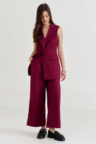 Комплект состоит из футболки и брюк. Брюки на эластичном поясе, с карманами, с лампасами вдоль боковых швов. Спереди по шву притачивания пояса заложены складки. Футболка прямого силуэта, с асимметричным низом и обработанным разрезом в нижней части удниненного бокового шва. На полочке расположены симметричные кокетки. Горловина обработана обтачкой. Рукав цельнокроеный короткий, обработанный бейкой из основного полотна.