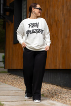 Костюм женский джемпер и брюки из трикотажа. Джемпер прямого кроя с дизайнерской печатью , полочка с накладным карманом.Джемпер с притачными рукавами и манжетами. Брюки женские прямого силуэта, пояс на резинке.Боковые карманы на молниях.По низу брюк обработаны разрезы на молниях.
