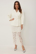 Брюки прямого силуэта с заутюженными стрелками и притачным поясом. Для максимально комфортной посадки по бокам пояса вставлена эластичная резинка. Застёжка на молнию с гульфиком и пуговица по поясу. По переду в боковых швах карманы. Задние половинки брюк с талиевыми вытачками. Длина жакета 74 см, длина рукава 62 см, длина брюк 112см.