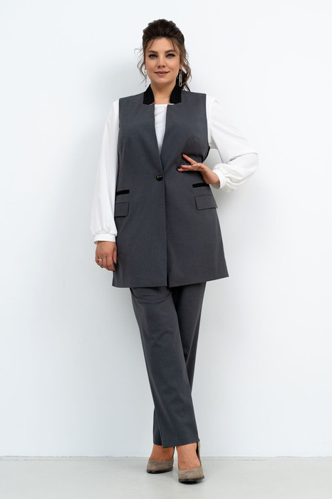 Оригинальный женский комплект тройка в классическом стиле - идеальный вариант для офиса.  Практичный и элегантный комплект поможет создать образ, который будет отлично смотреться на любом типе фигуры. Жилетка прямого силуэта, с застёжкой на 1 петля и пуговицу. Воротник стойка; по переду жилетки отделочные клапана, и функциональные карманы в рамку. Спинка жилетки со средним швом и шлицей по низу. Жилетка без подкладки. Блузка прямого силуэта с округлой горловиной, нагрудными вытачками и разрезами в боковых швах. Рукава втачные с манжетой по низу. Брюки прямого силуэта, длинные с притачным поясом и вставкой резинки по бокам, которая обеспечивает максимально комфортную посадку на любой тип фигуры. В боковых швах брюк карманы.  Длина жилетки 83 см, длина блузки 65 см, длина рукава 64 см, длина брюк 107 см.