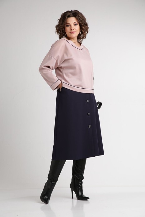 Комплект женский- юбочный. Туника из высококачественного трикотажного полотна стойкого к растяжению. Вырез горловины V- образный с отделочным декоративным кантом. Рукав втачной на спущенной пройме. По левой части переда накладной карман с декоративной нашивкой. Юбка А-образного силуэта с карманами в боковых швах. По переду планка декорированная пуговицами. Застежка потайная молния в среднем шве заднего полотнища. Для максимально комфортной посадки по бокам пояса вставлена эластичная резинка. Длина туники 59 см, длина рукава от горловины 68 см. Длина юбки 79 см.