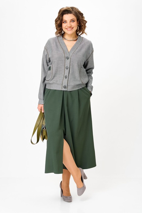 Юбка миди с глубокими встречными складками и разрезом по переду добавляет образу женственности. В боковых швах карманы. Юбка на подкладке.  Для максимально комфортной посадки по бокам пояса вставлена эластичная резинка. Сочетание мягкого верха и строгого низа создаёт баланс между комфортом и аккуратностью, делая комплект универсальным для офиса, повседневных выходов и стильных деловых встреч.