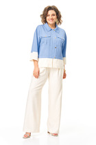 Костюм в стиле спорт-шик сочетающий в себе женственность и комфорт. Сочетание двух тканей трикотажного полотна и костюмной ткани добавляет оригинальность. Жакет со спущеным плечем и декорирован печатью по левой части переда, воротник пиджачного типа. По пинии плеча паты с полукольцом. Рукав втачной одношовный с манжетой по низу. Спинка с кокеткой и отлетной планкой. Понизу довяз и регулируемая кулиса. Брюки, слегка зауженные к низу, свободного силуэта. По переду вблизи боковых швов карманы. Для максимально комфортной посадки по поясу вставлена эластичная резинка.