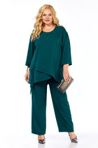 Жакет полуприлегающего силуэта, отрезной по линии талии с центральной застежкой на две петли и пуговицы. Верхняя часть переда с рельефными швами и конструктивным подрезом, нижняя часть с прорезными карманами. Спинка со средним швом и рельефными швами в верхней части. Рукава втачные, двухшовные. Жакет на подкладке и с плечевыми накладками. Блуза прямого силуэта без воротника, с фигурной линей низа. Горловина обработана окантовочным швом. Перед с нагрудными вытачками. Рукав – крылышко. Брюки длинные со сгибом, на притачном поясе с пятью шлевками. Застежка спереди на тесьму-молнию и одну петлю и пуговицу. Передние части с имитацией косых боковых карманов. Задние части с талиевыми вытачками. Р52, 54, 56 пояс с резинкой по боковым швам.