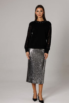 Жакет прямого, свободного силуэта, с двубортной застёжкой на петли и пуговицы и с в внутренней застёжкой на петлю и пуговицу, перед и спинка на подкладке, по левой стороне декорирован съёмной оборкой пристёгивающаяся под лацканом на пришивные кнопки.