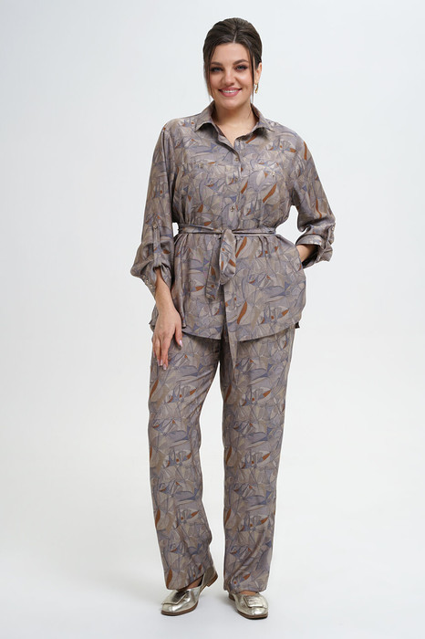 Блузка прямого, свободного силуэта, в дополнении пояс, с застёжкой на петли, пуговицы, по боковым разрезы. Перед с нагрудными выточками, накладными карманами пристёгивающиеся на петлю, пуговицу. Спинка с притачной кокеткой и мягкой встречной складкой. Рукава втачные, одношовные, длинные, понизу с разрезом, мягкой складкой и притачными манжетами на петли, пуговицы, с патой фиксируемая длину рукава на петлю, пуговицу. Воротник стояче отложной на отрезной стойке на петлю, пуговицу.