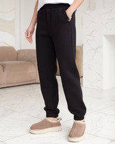 Брюки прямого, свободного силуэта, с притачным поясом со шлёвками, по боковым на резинке, с застёжкой типа «гульфик» на молнию и по краю пояса на пробивную петлю и пуговицу. С переходящими боковыми швами на перед с закрытым срезом на лица. Передние части с фигурными боковыми карманами. Задние части с кокеткой и накладными карманами. По низу имитация цельнокроеной манжеты.