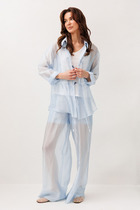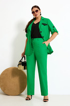 Жакет свободного силуэта с застежкой по переду на кнопки. Воротник отложной. По переду отрезные кокетки, накладные карманы с клапанами. По спинке кокетка и рельефы. Рукав двухшовный с притачной манжетой на кнопках. Низ жакета на притачном поясе.