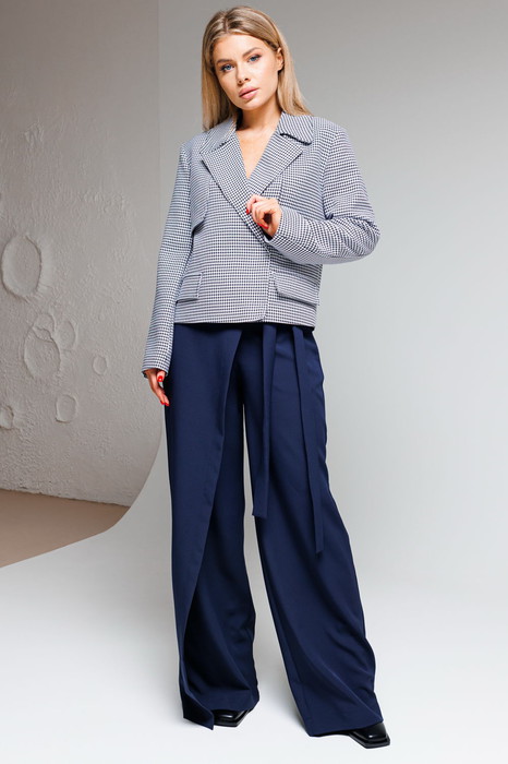 Жакет прямого силуэта, с воротником пиджачного типа. По переду и спинке отлетные кокетки. По переду в области талии декоративные клапаны. Жакет на подкладке. Застежка на пришивные кнопки.