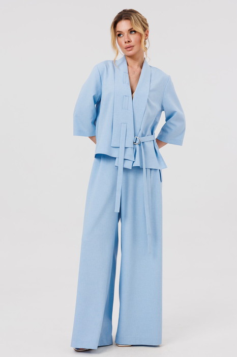Жакет женский прямого силуэта, с декоративным воротником и ассиметричным низом. Рукав 3/4. Застежка пояс с пряжкой.