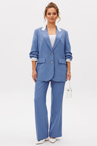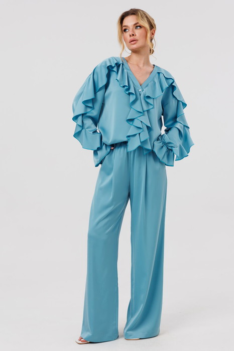 Блузка женская свободного силуэта с застежкой по переду на пуговицы. По переду блузки и по рукавам декоративные воланы.