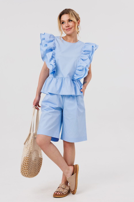 Блузка женская свободного силуэта, с рюшей по линии талии. По переду и спинке лифа рельефы с двумя притачными рюшами. По спинке вырез "Капелька" с застежкой на кнопку.