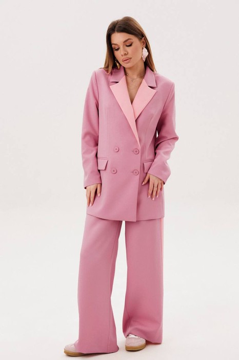 Жакет прямого силуэта, оснащен двухбортной застежкой на петли-пуговицы, что добавляет образу официальности. Детализированный дизайн включает нагрудную вытачку, переходящую в прорезной карман с клапаном на передней части, и фигурный рельеф на спинке с щлицей, обеспечивающий отличную посадку по фигуре. Рукав жакета двухшовный, подчеркивающий линии рук. Жакет на подкладке для дополнительного комфорта.